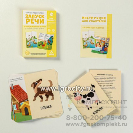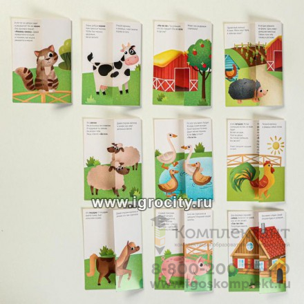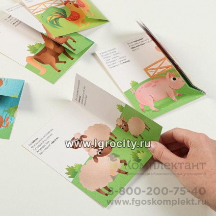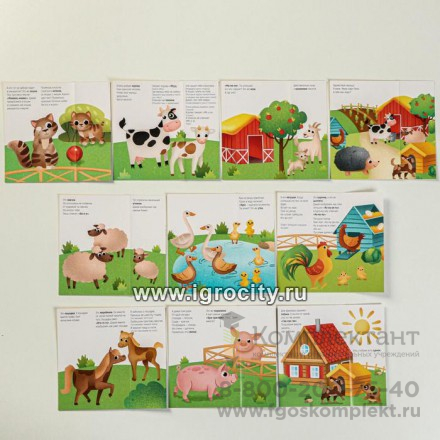 Занятия с набором карточек помогут расширить представления малыша о домашних животных на ферме, словарный запас ребёнка, развить мелкую моторику, внимание, коммуникацию, речь и слух. А чтобы играть было интересно, на картинках есть элементы, которые нужно открыть. Занятие с карточками включает в себя Знакомство с животным. Одновременно расширяет и тренирует пассивный словарь ребёнка, восприятие речи на слух, а также воображение. Если у вас есть игрушка, изображающая животное, воспользуйтесь ею, рассказывая стишок или показывая соответствующую картинку. Знакомство со звуками. Зачитайте текст, покажите и изобразите звуки или движения по инструкции-подсказке. Затем повторите текст вместе с ребёнком. Основной способ развития детей в раннем возрасте — подражание взрослому. И чем эмоциональнее, артистичнее вы покажете ребёнку, тем ему будет интереснее. Пальчиковую гимнастику. Упражнения развивают мелкую моторику, артикуляционный аппарат и слуховое восприятие. Внутри вы найдёте: 10 карточек размером 105 × 148 мм (картон, 220 г), инструкцию для родителей.