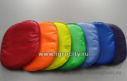 Комплектация: 7 мягких плоских разноцветных фигур овальной формы, в мешке для хранения. Фигуры выполнены в цветах радуги. Размер: овал вписан в прямоугольник со сторонами 40 и 32 см, мешок для хранения - 73х60 см.