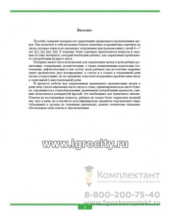 Пособие предназначено для закрепления звуков в речи у детей 4—7 лет. В нем представлено несколько блоков сюжетных и предметных картинок на звуки, которые чаще всего вызывают затруднения при произнесении ([с], [ц], [ш], [ч]). К каждому блоку картинок предлагаются вопросы и задания по материалу, который необходим ребенку для закрепления правильного употребления нужного звука.