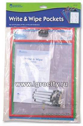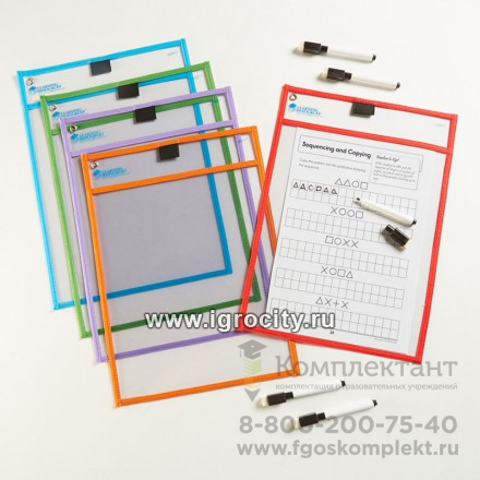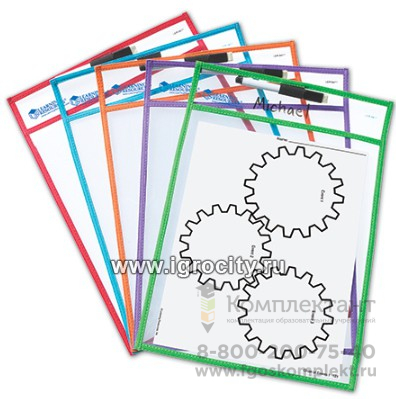 Прозрачные папки "Пиши и стирай", в наборе 5 папок и 5 маркеров (на колпачке маркера - мини-губка), Learning Resources, арт. LER0477