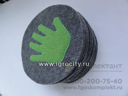 «Пяточки-Ладошки» - 20 кругов диаметром 24 см: с ладошками – 10 шт., с пяточками – 10 шт. Раскладывание пар пяточек и ладошек в форме лабиринта позволяет координировать верхнюю и нижнюю часть туловища, двигаться на 4-х точках опоры последовательно или прыгать параллельно. Можно придумывать разные комбинации для движения по цвету и по наименованию – пяточки или ладошки, правая или левая. Можно составить и играть в группе в игру «Твистер». Чтобы круги не скользили, играйте на ковре или ковролине.