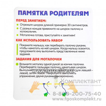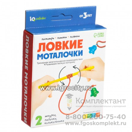 Развивающий набор «Ловкие моталочки» поможет малышу потренировать однонаправленные и разнонаправленные мелкие движения руками и пальцами, научиться координировать свои действия и концентрироваться на задании. Как пользоваться набором Внутри вы найдёте 2 шнурка, 2 палочки, 2 колокольчика и памятку. Перед занятием отрежьте шнурок длиной примерно 30 сантиметров. С разных концов привяжите на шнурок палочку и колокольчик. Покажите малышу, как перебирать палочку руками, чтобы намотать на неё шнурок. Когда ребёнок освоится, предложите ему выполнить задания из памятки. Например, попросите кроху взять моталочку одной рукой за кончик палочки и перебирая пальцами, намотать на неё шнурок. Для начала пусть малыш выполнит задание одной рукой, затем попросите кроху выполнить задание двумя руками одновременно. Так ребёнок потренирует логическое мышление, мелкую моторику, ловкость и внимание. Набор рекомендовано детям от 3 лет. Комплектация Колокольчик, 2 шт: 2 × 2 × 1,5 см. Палочки, 2 шт: 0,3 × 0,3 × 12 см. Шнуровка.