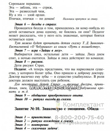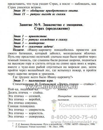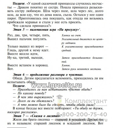 В книге предложена программа занятий по методу сказкотерапии с детьми старшего дошкольного возраста, имеющими нарушения в развитии речи. Программа основана на союзе «Ребенок - Родитель - Педагог» и направлена на повышение детской самооценки, увеличение словарного запаса детей, на развитие их воображения и мышления. Содержание Предисловие3 Что такое сказкотерапия?5 Сказкотерапия и развитие речи6 Основные этапы работы7 Организация исследования15 Анализ результатов17 План-программа игровых тематических занятий «Путешествие в сказочную страну»24 Учебно-тематический план24 Занятие № 1. Вводное26 Занятие №2. Рисование сказочной страны29 Занятие №3. Сказка в нарисованной стране32 Занятие №4. Первое сказочное путешествие34 Занятие №5. Второе сказочное путешествие36 Занятие №6. Знакомство с эмоциями. Радость.Часть 139 Занятие №7. Знакомство с эмоциями. Радость.Часть 242 Занятие №8. Знакомство с эмоциями. Страх. Часть143 Занятие №9. Знакомство с эмоциями. Страх. Часть245 Занятие №10.Знакомство с эмоциями. Обида46 Занятие №11.Коррекция поведения (упрямство)49 Занятие № 12.Владение чувствами. Часть 150 Занятие № 13.Владение чувствами. Часть 252 Занятие №14.Коррекция поведения53 Занятие №15.Развивающее занятие56 Занятие №16.Предновогоднее занятие57 Занятие № 17. Развивающее занятие «В страну звуков и шумов»60 Занятие №18. Развивающее занятие. Понятие оконструировании 62 Занятие №19.Вадеологические сказки. Часть163 Занятие №20.Вадеологические сказки. Часть265 Занятие №21.Вадеологические сказки. Часть366 Занятие №22.Вадеологические сказки. Часть468 Занятие №23.Вадеологические сказки. Часть569 Занятие №24.Куклы-марионетки. Часть 170