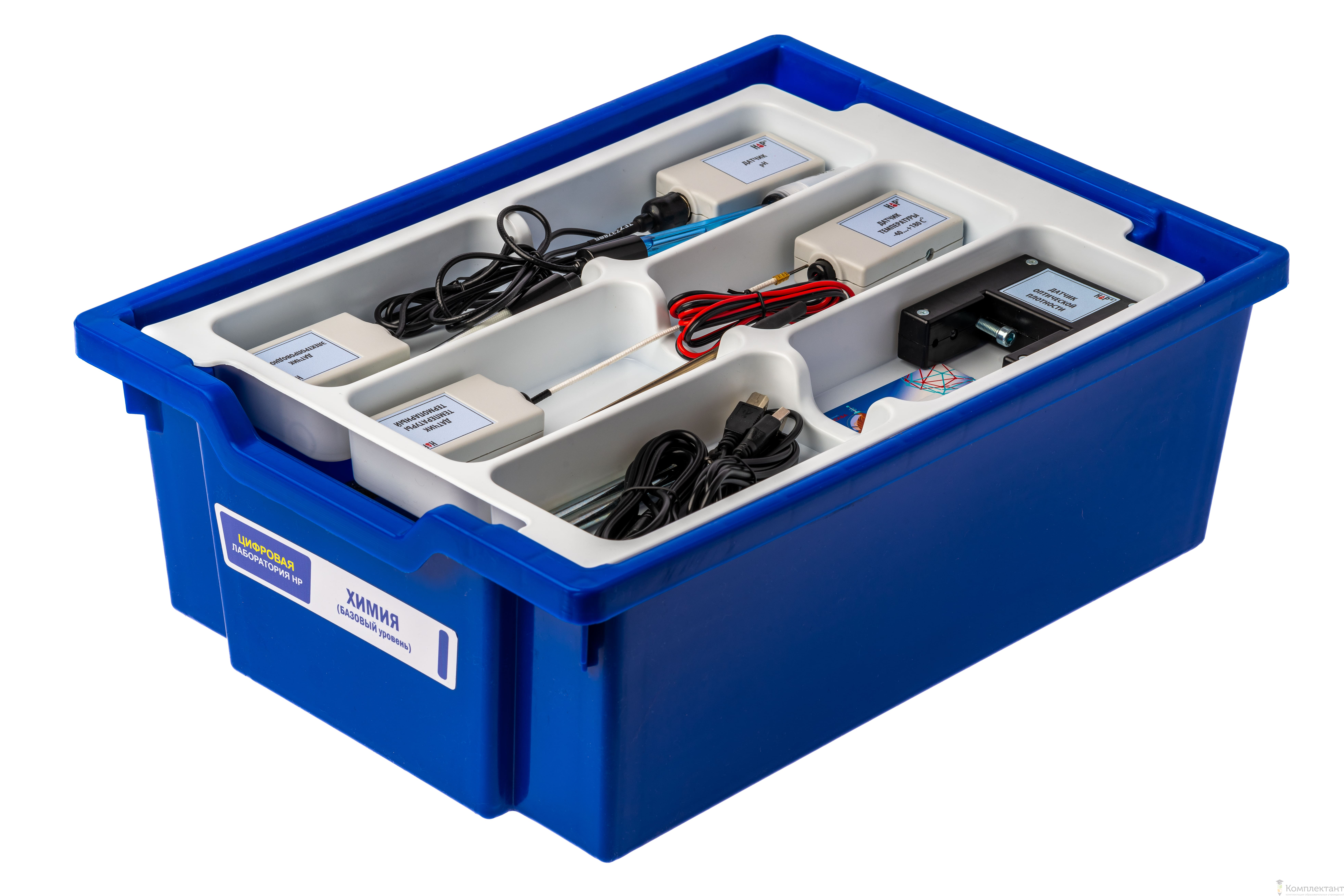 Цифровая лаборатория укомплектована в пластиковую систему хранения, которая закрывается прозрачной пластиковой крышкой на защелках для обеспечения наблюдения за содержимым. Комплект оборудования и датчики в системе хранения располагаются на ложементах.