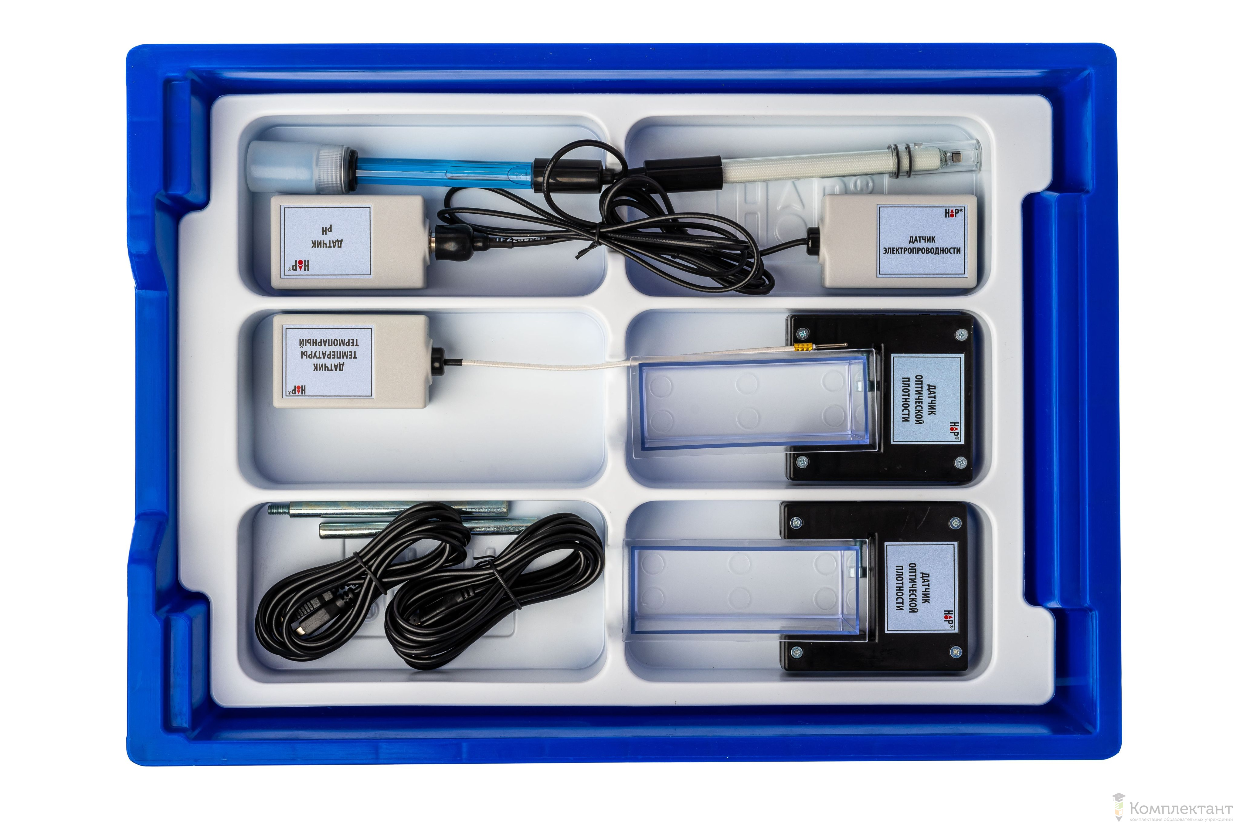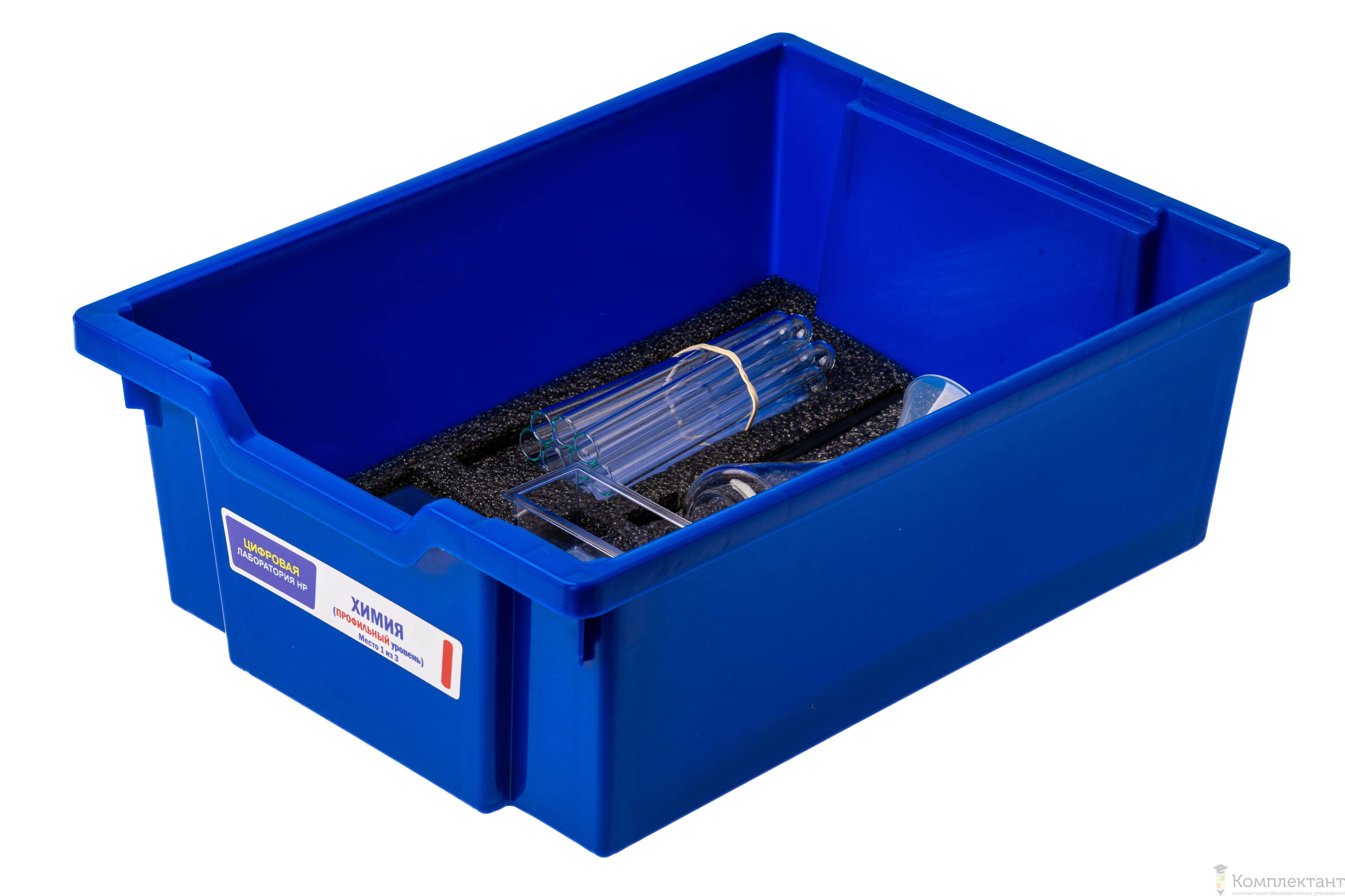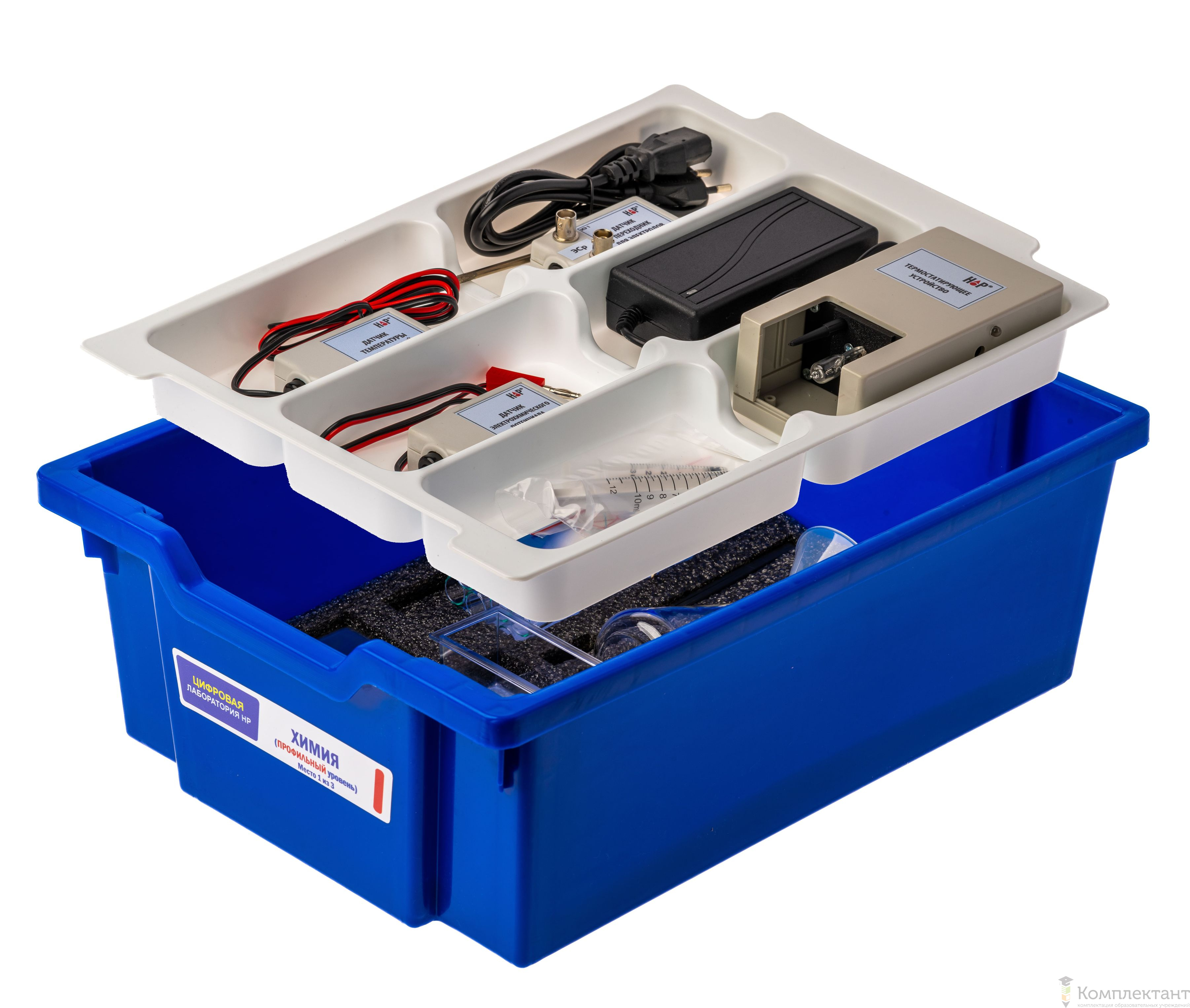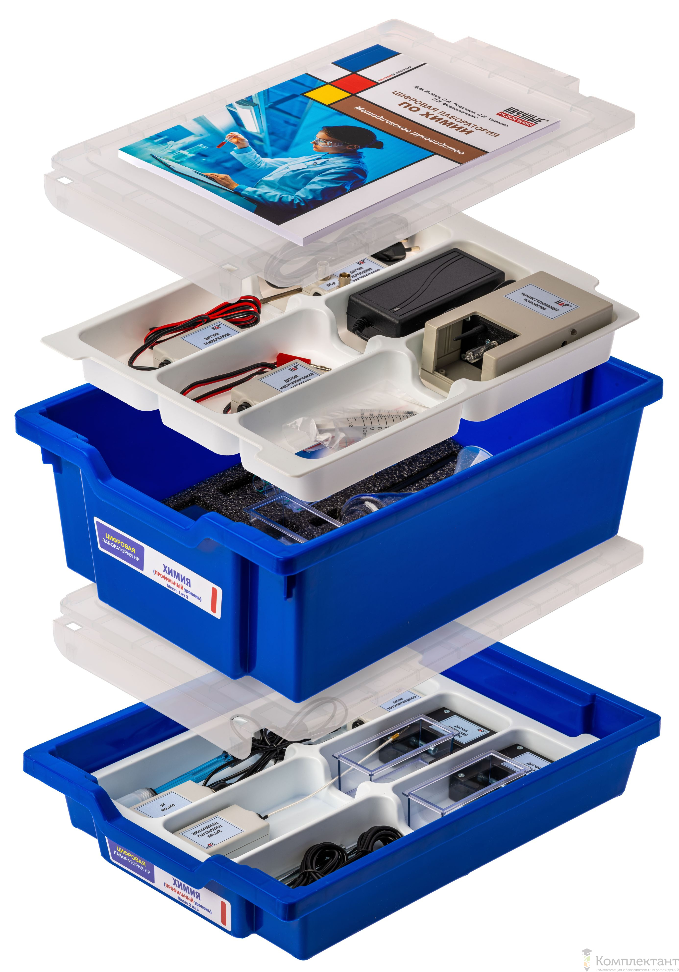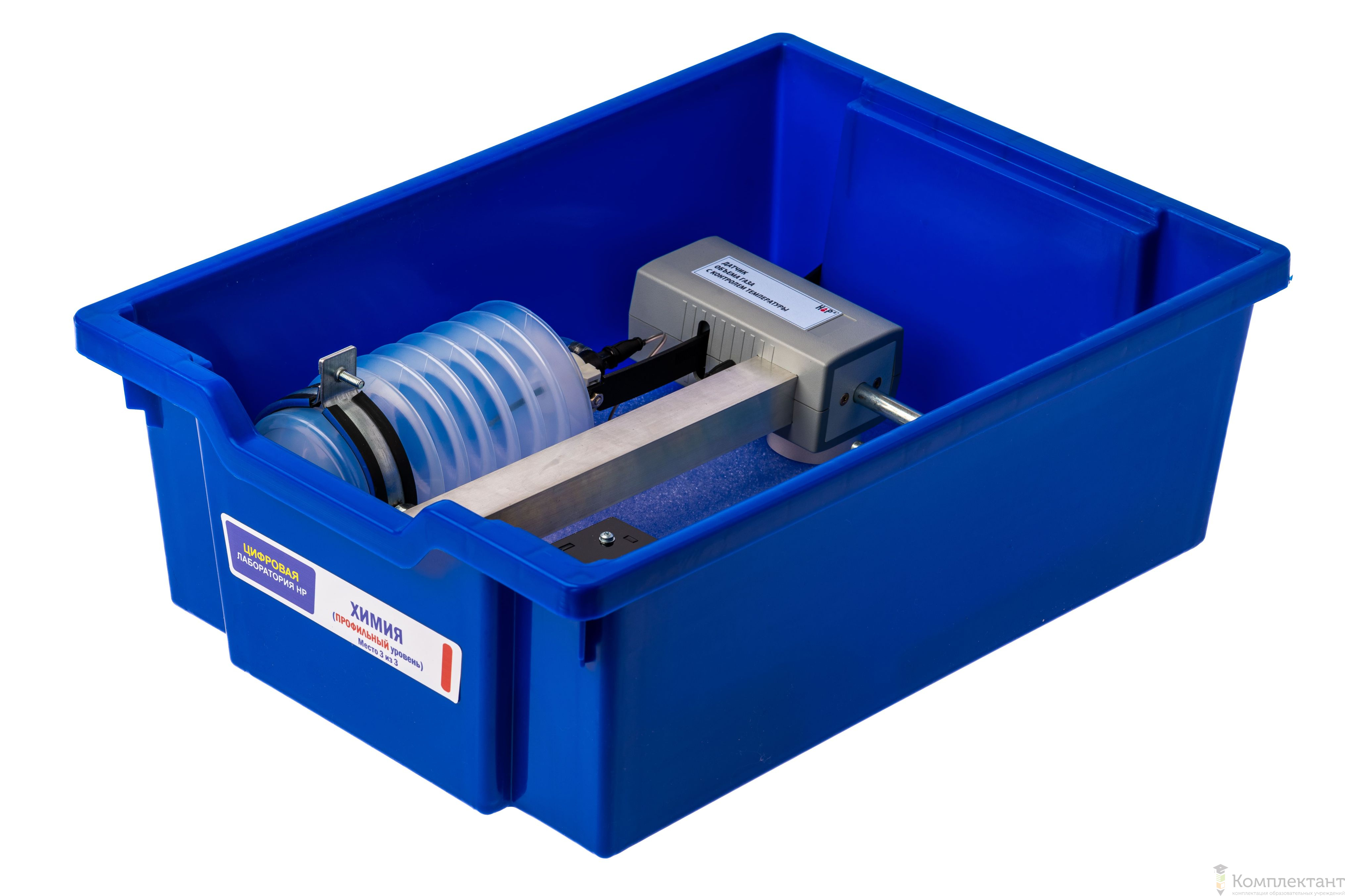 Цифровая лаборатория укомплектована в пластиковую систему хранения, которая закрывается прозрачной пластиковой крышкой на защелках для обеспечения наблюдения за содержимым. Комплект оборудования и датчики в системе хранения располагаются на ложементах.